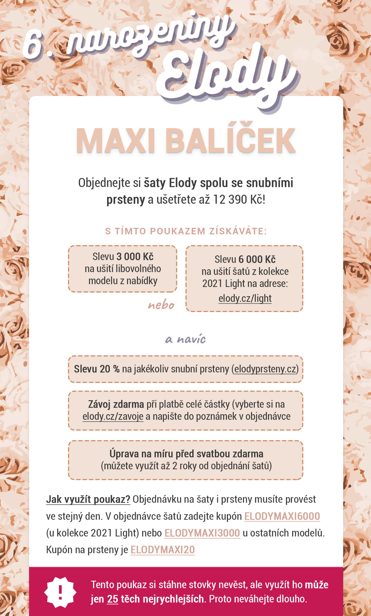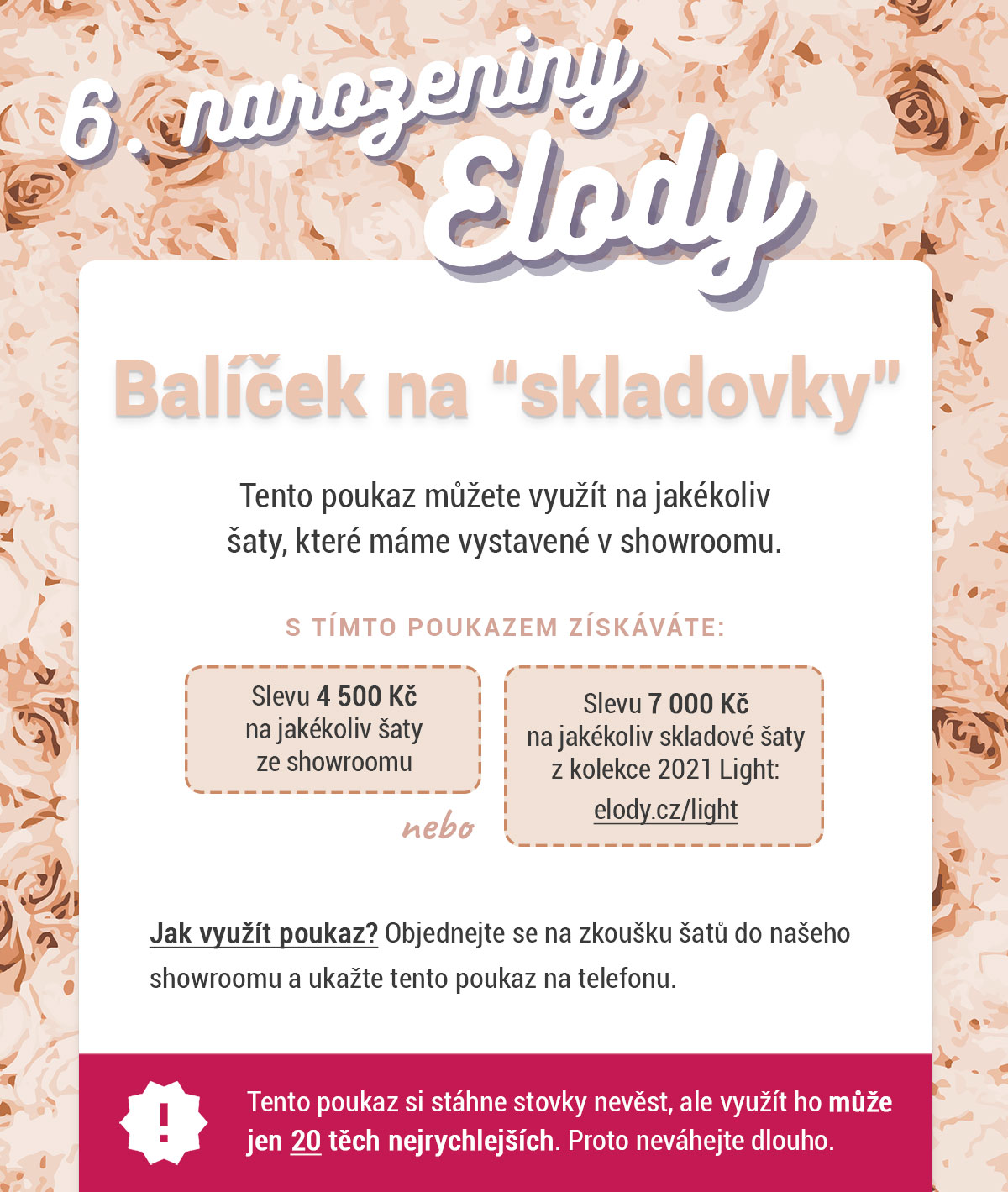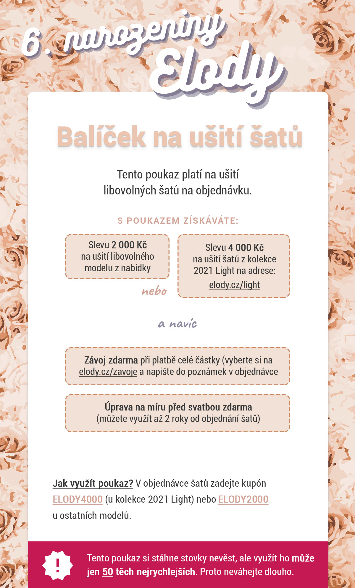 Objednejte si poukaz s platností 1 rok a získáte podobné výhody, jako u ostatních balíčků, s tím rozdílem, že šaty můžete objednat kdykoliv v roce 2021.
